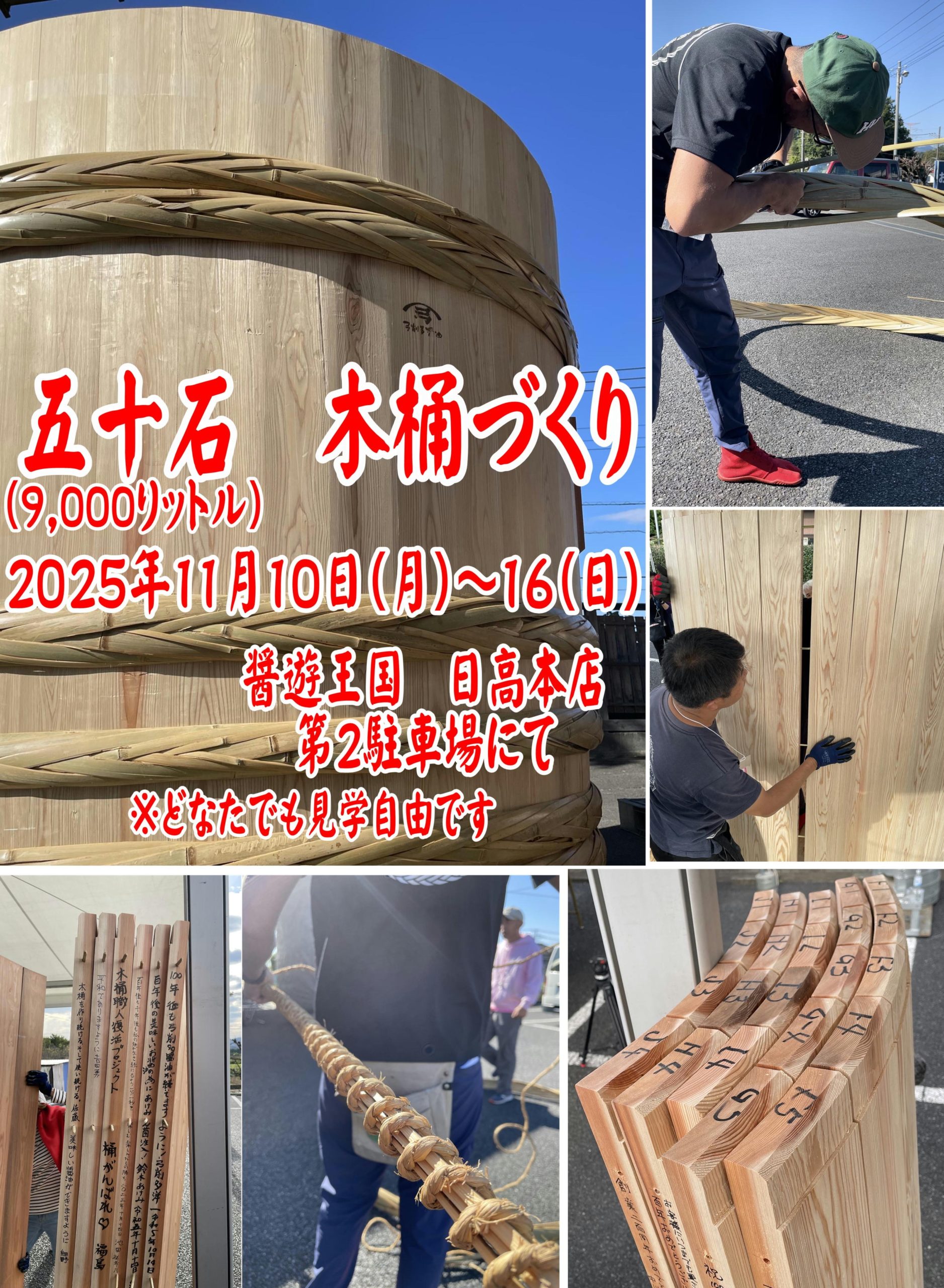 202511月10日(月)より16()まで、醤遊王国 日高本店 第2駐車場にて「五十石 木桶づくり」を行います。地元の杉材である西川材を使用した、五十石(9,000リットル)の木桶を作る様子を間近でご覧いただけます。完成した杉桶は「百年蔵」にて、醤油づくりに百年以上使用されます。