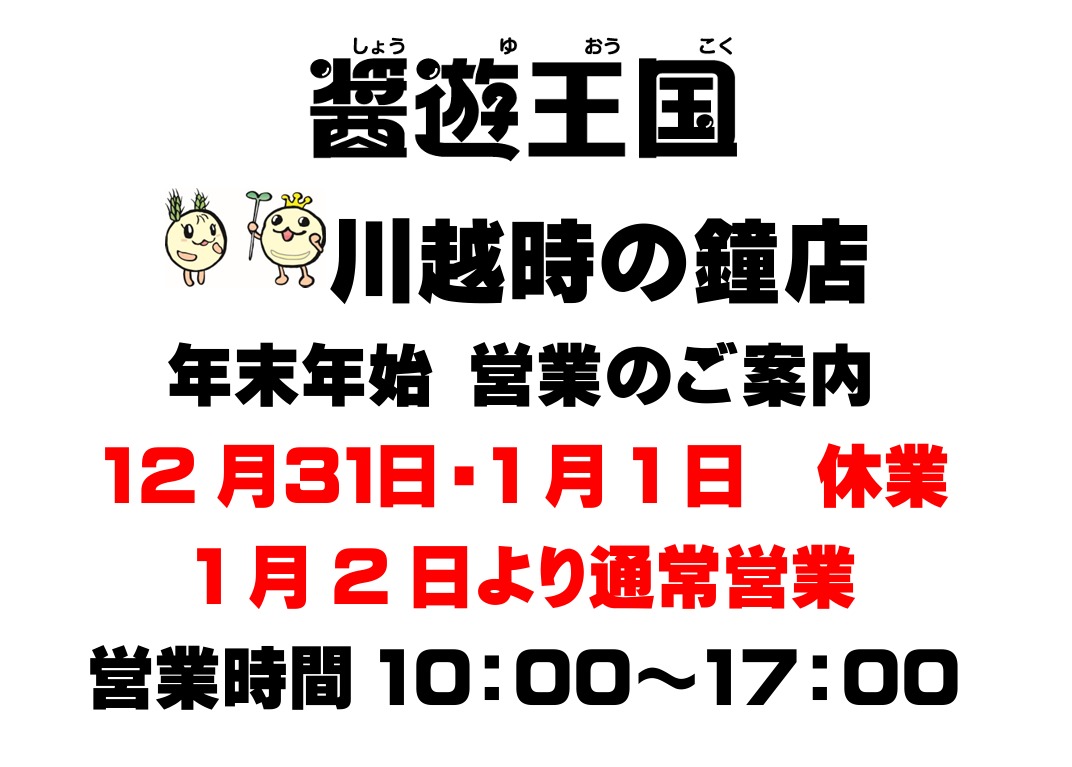 - 年末年始の営業のご案内・・・【醤遊王国 日高本店】12月31日1階のみ営業/1月1日~1月3日まで休業 /1月4日より通常営業・・・【醤遊王国 川越時の鐘店】12月31日休業 /1月1日休業/1月2日より通常営業