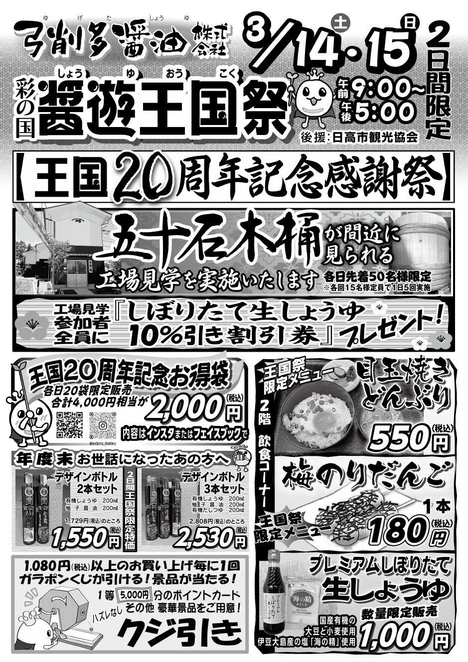 2026年3月14日(土)、3月15日(日)の2日間、「王国20周年記念 醤遊王国祭」を開催いたします。また、3月16日(月)より3月22日(日)までは「五十石木桶づくり」も行います。只今、クラウドファンディング公開中です。